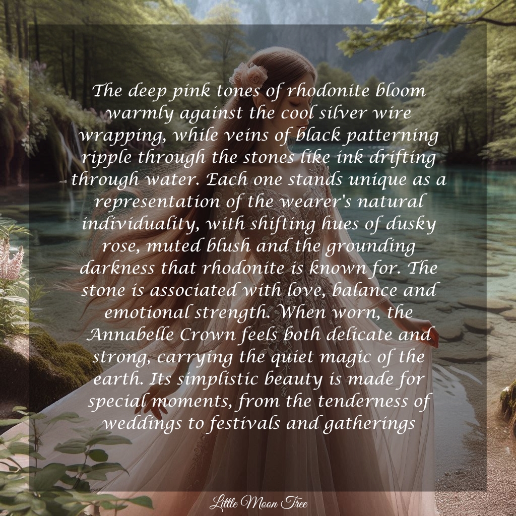 ☽ The deep pink tones of rhodonite bloom warmly against the cool silver wire wrapping, while veins of black patterning ripple through the stones like ink drifting through water. Each one stands unique as a representation of the wearer's natural individuality, with shifting hues of dusky rose, muted blush and the grounding darkness that rhodonite is known for. The stone is associated with love, balance and emotional strength. When worn, the Annabelle Crown feels both delicate and strong, carrying the quiet magic of the earth. Its simplistic beauty is made for special moments, from the tenderness of weddings to festivals and gatherings ☾