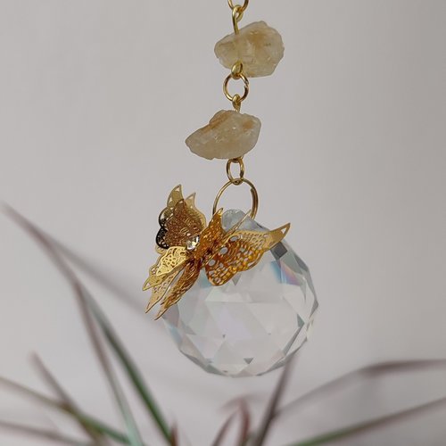 ☽ Handmade suncatcher featuring a glass crystal sphere, gold butterfly and raw citrine clusters. An adjustable chain with clasp makes this convenient for hanging and it also comes with a free split ring attachment ☾