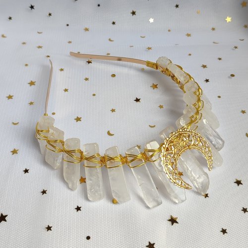 ☽ The Elora Crown is a beautifully handcrafted piece that combines the natural beauty of quartz with the elegance of a filigree moon, lovingly wire wrapped onto a headband. Simple yet versatile, quartz stands as a beacon of clarity that amplifies the wearer's energy with its radiant glow. The contrasting gold moon, royal and divine, is associated with femininity and intuition - a guide through the labyrinth of the subconscious. The Elora Crown adapts effortlessly to different styles and is perfect for any special occasion, from galas to a quiet night under the stars. It promises to elevate your presence, to stand out not just in appearance but in spirit ☾
