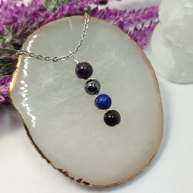 ☽ Gemstone pendant for good luck in any area with four beads wrapped in silver plated wire. Beads include citrine, amazonite, tiger's eye, aventurine and measure approximately 7mm-8mm each. Comes with an 18 inch stainless steel chain or waxed cotton cord and presented in an organza bag with information card ☾