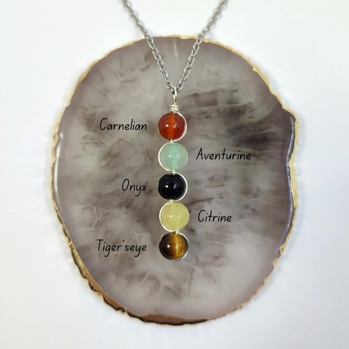 ☽ A necklace for the sign of Leo with five gemstone beads wrapped in silver plated wire. Beads include carnelian, aventurine, onyx, citrine, tiger's eye and measure approximately 7mm-8mm each. Comes with an 18 inch stainless steel chain or waxed cotton cord ☾