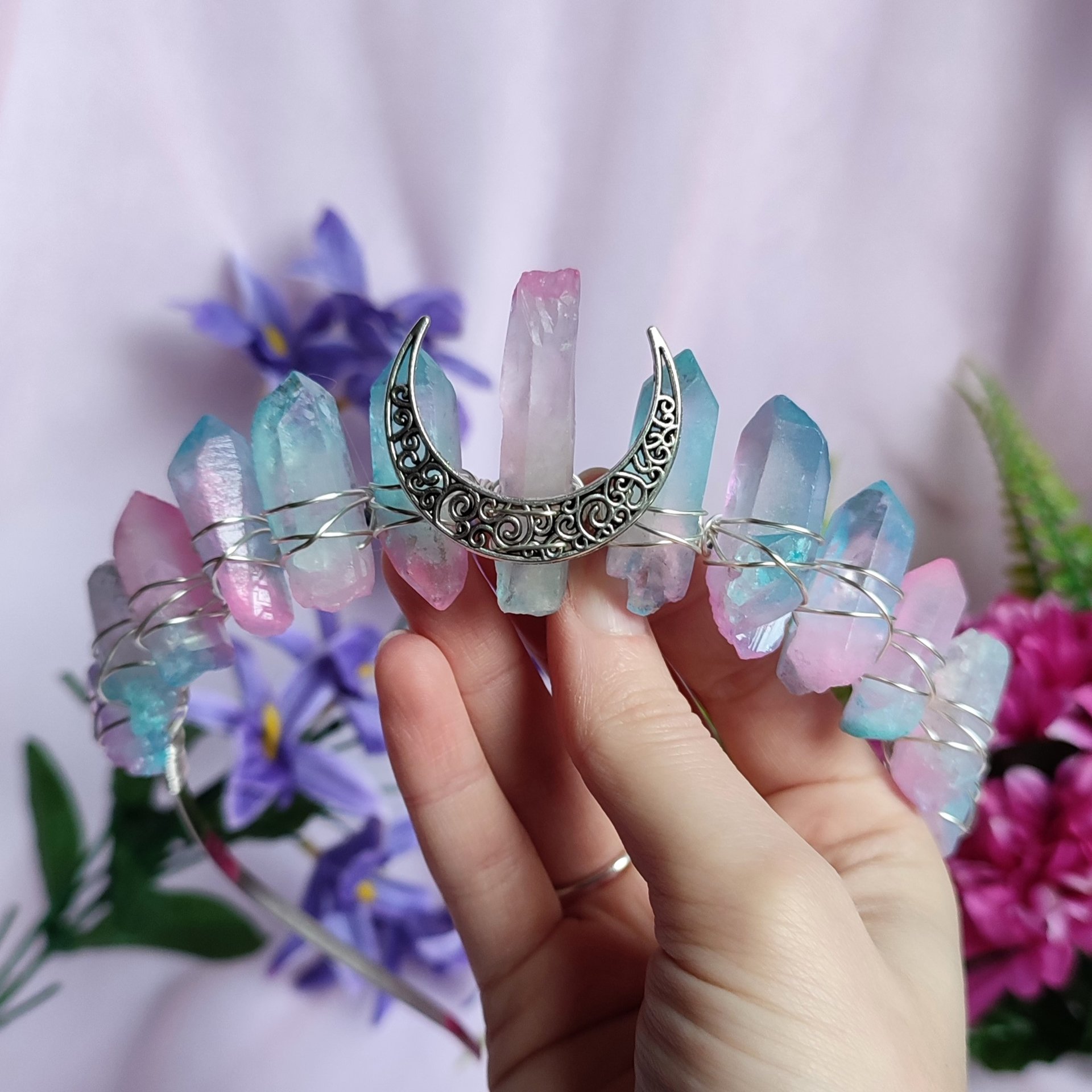 ☽ The Moon Candy Crown whispers of forgotten magic, with the soft pastel hues of titanium quartz and lunar blessings. Blue calls to mermaids from the ocean depths; pink sings to dancing fairies and silver accents glint like the unicorn's horn as it gallops through starlit meadows. At the heart of the crown, a filigree moon beckons to stardust souls, and those who wear it feel the pull of enchanted forests and fantasy realms. Brides and prom queens adorn themselves with its beauty, and it blesses the journeys of mother's-to-be. Let the Moon Candy Crown spark your imagination and remind you that magic is real! ☾